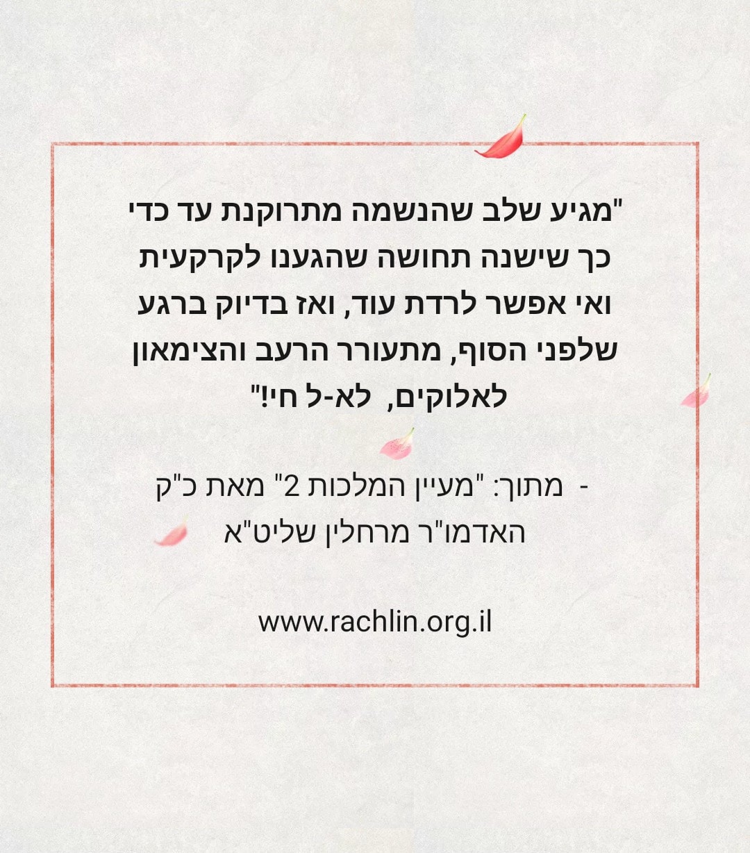 "מגיע שלב שהנשמה מתרוקנת עד כדי כך שישנה תחושה שהגענו לקרקעית ואי אפשר לרדת עוד, ואז בדיוק ברגע שלפני הסוף, מתעורר הרעב והצימאון לאלוקים, לא-ל חי!"