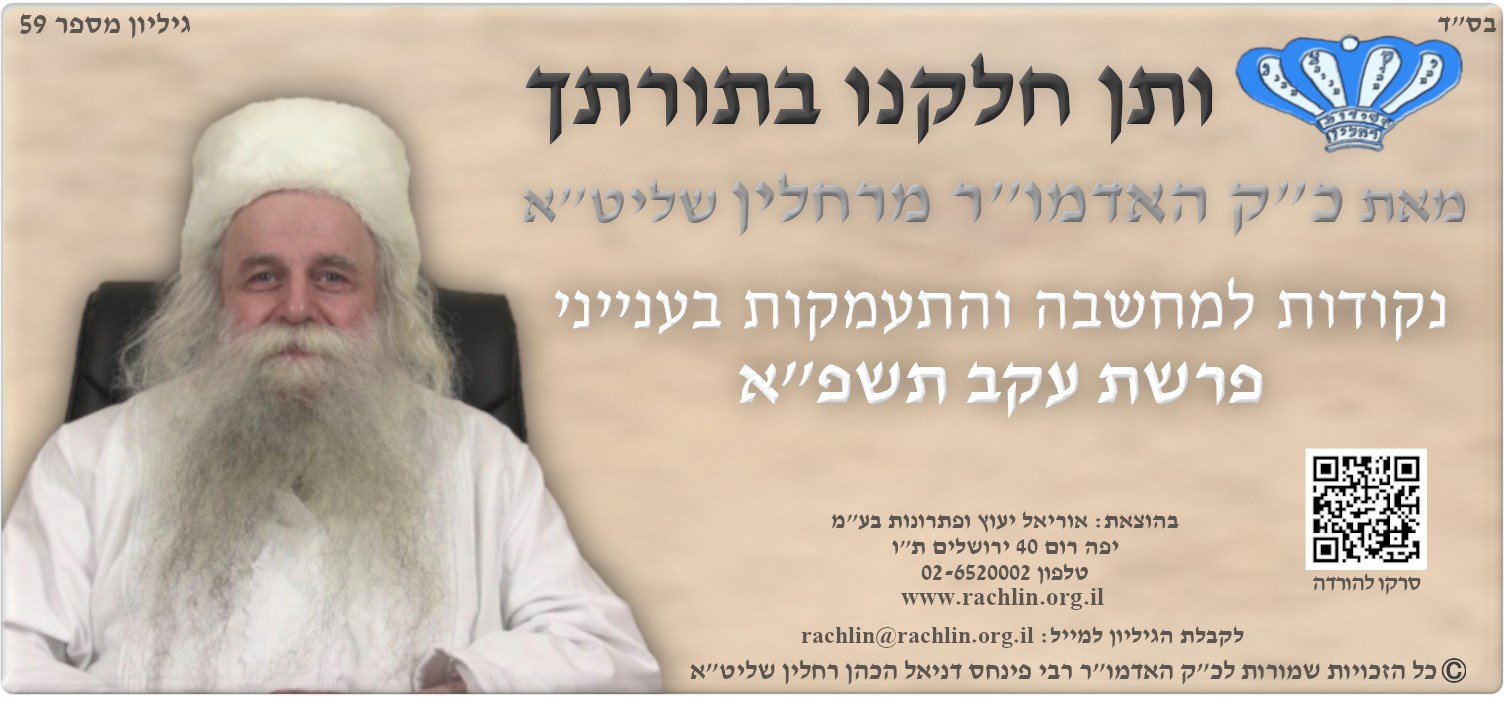 הערה: מאמר זה הינו תמלול של שיעור בפרשת השבוע שהעביר כ"ק האדמו"ר רבי פינחס דניאל הכהן רחלין שליט"א. לא הוכנסו שינויים על מנת לשמר את הסגנון המקורי.